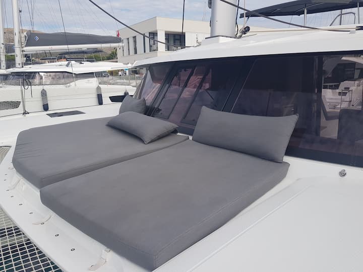 5-cabin Fountaine Pajot Isla 40 catamaran was built in 2022 and it is anchored in Dubrovnik, Croatia. The catamaran can accommodate up to 9 people. The catamaran offers 4 bathrooms. The catamaran can be rented as bareboat. Boat equipment features 2 motor, full batten main sail and self-tacking jib. It also boasts an outside speaker and inside speaker. The fully-equipped galley includes a refrigerator, kitchen equipment, freezer, oven and stovetop. This catamaran is operated by the listing owner Marija. Marija is a viravira.co member since 2019 and a Super Boat Owner.