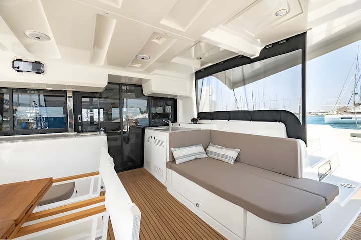 6-cabin Lagoon 46 catamaran was built in 2024 and it is anchored in Piso Livadi, Greece. The catamaran can accommodate up to 10 people. The catamaran offers 5 bathrooms. The catamaran can be rented as bareboat. Boat equipment features 2 motor, full batten main sail and self-tacking jib. It also boasts an outside speaker and inside speaker. The fully-equipped galley includes a refrigerator, kitchen equipment, freezer, oven and stovetop. The fleet operator is a viravira.co member since 2019.