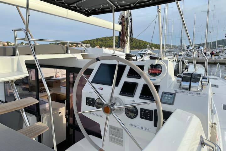 4-cabin Fountaine Pajot Astrea 42 catamaran was built in 2022 and it is anchored in Rogoznica, Croatia. The catamaran can accommodate up to 10 people. The catamaran offers 4 bathrooms. The catamaran can be rented as skippered or bareboat. Boat equipment features 2 motor, full batten main sail and self-tacking jib. It also boasts a tv, outside speaker and inside speaker. The fully-equipped galley includes a refrigerator, kitchen equipment, oven, stovetop and coffee machine. This catamaran is operated by the listing owner Kirstin. Kirstin is a viravira.co member since 2019.