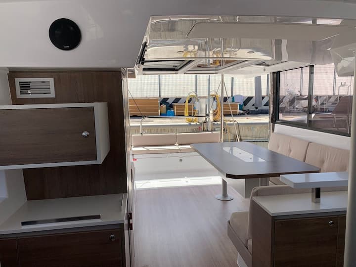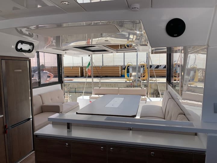 4-cabin Bali Catspace catamaran was built in 2022 and it is anchored in Salerno, Italy. The catamaran can accommodate up to 10 people. The catamaran offers 4 bathrooms. The catamaran can be rented as bareboat. Boat equipment features 2 motor, full batten main sail. It also boasts an outside speaker and inside speaker. The fully-equipped galley includes a refrigerator, kitchen equipment, freezer, oven and stovetop. The fleet operator is a viravira.co member since 2019.
