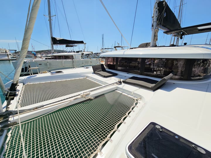 4-cabin Lagoon 42 catamaran was built in 2022 and it is anchored in Seget Donji, Croatia. The catamaran can accommodate up to 12 people. The catamaran offers 4 bathrooms. The catamaran can be rented as bareboat. Boat equipment features 2 motor, full batten main sail, self-tacking jib, electric windlass and bow thruster. The fully-equipped galley includes a refrigerator. The fleet operator is a viravira.co member since 2019.
