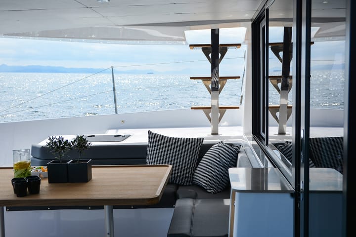 6 -cabin Dufour 48 Catamaran catamarán se construyó en 2019 y está anclado en Lefkada, Grecia. El catamarán puede alojar hasta 11 personas . El catamarán ofrece 5 baños. El catamarán se puede alquilar con patrón sin tripulación . Características del equipo del barco 2 motor, listón completo vela principal y jab autoadhesivo. También cuenta con altavoz externo. La cocina totalmente equipada incluye nevera y máquina de café. Este catamarán lo gestiona el propietario del anuncio Thrace. Thrace es miembro de viravira.co desde 2019 .
