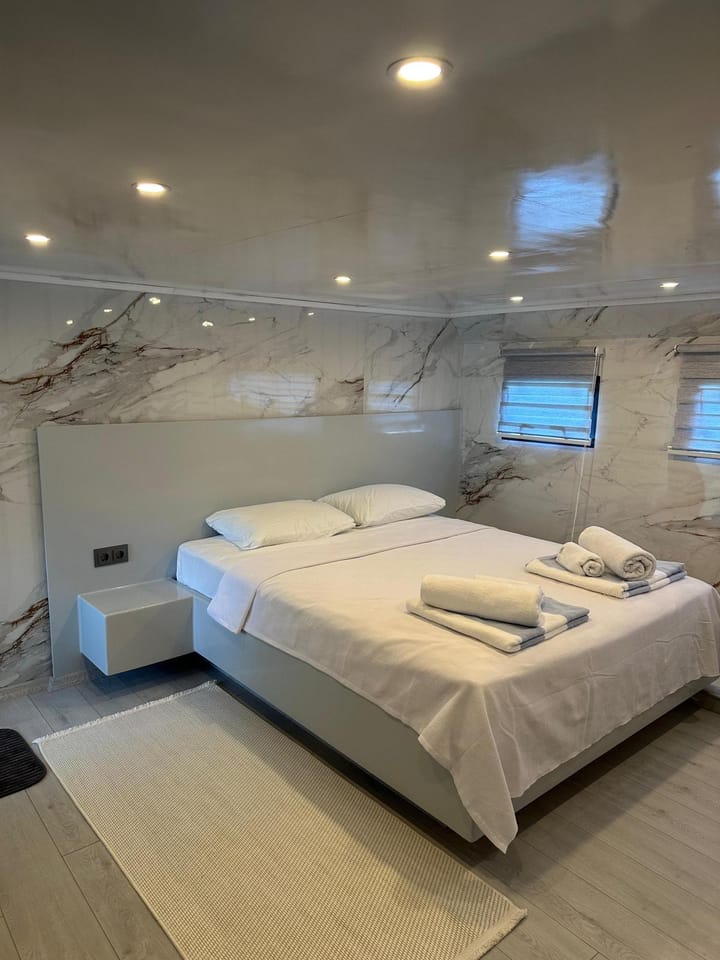El yate o arrastrero a motor modelo 2025 hecho a medida tiene una longitud de 21 metros y una anchura de 6 metros. Nuestro barco tiene 2 cabinas principales y 2 cabinas dobles. El yate a motor, que tiene un total de 4 cabinas, ofrece servicio de alquiler de yates para hasta 12 personas. Está registrada en el puerto de Fethiye y ofrece alquiler de barcos a nuestros huéspedes en las bahías de Fethiye y la región de Göcek. Con sus 4 tripulantes profesionales, sirve a nuestros queridos huéspedes como alojamiento en las bahías de Göcek. Sala de estar separada para la tripulación Hay una abeja, una cocina totalmente equipada, zonas de comedor interior y exterior, zonas de relajación y un bar americano. Hay suficientes colchones solares, sillas y juegos de servicio disponibles para todos los huéspedes. Este barco, que ofrece comodidad, lujo y tranquilidad a los huéspedes de Blue Cruise, alcanza un máximo de 15 nudos de millas náuticas. La máquina de agua, el aire acondicionado, la televisión, la WI-FI, la PlayStation 5, el generador, la tabla de remo y la canoa están disponibles en el yate y se han pensado todos los detalles para sus vacaciones en un crucero azul. Antes de las vacaciones en barco, nuestro cocinero del barco contacta con usted y planifica su lista de compras juntos. Puede suministrar sus propios suministros de comida y bebida si lo desea, o nuestra tripulación del barco se los puede suministrar en su nombre.