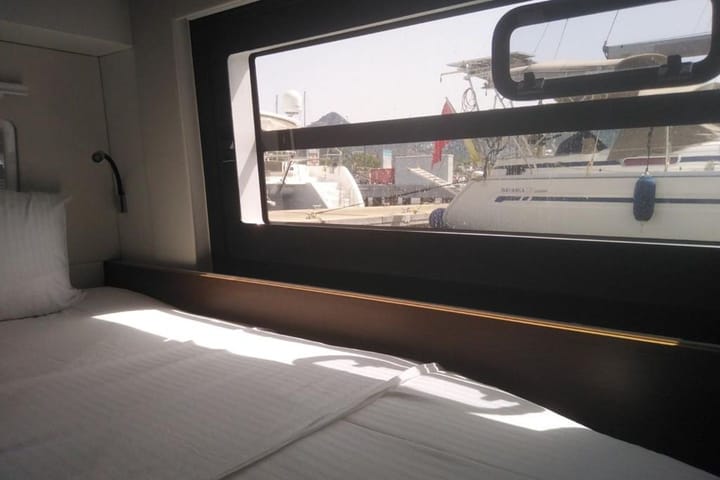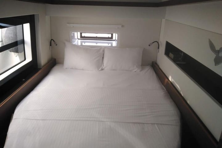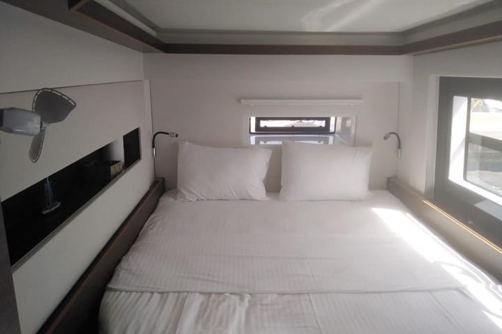 Option confortable et moderne pour ceux qui souhaitent explorer les baies uniques de Bodrum, le catamaran Nautitech 46 Fly propose une expérience de visite en bleu inoubliable avec sa structure modèle 2020 et ses espaces de vie spacieux. Notre bateau de 13 mètres de long peut accueillir 8 personnes dans 4 cabines doubles. Le bateau, qui bénéficie d'un service de capitaine professionnel, dispose du Wi-Fi, d'une cuisine entièrement équipée, d'un réfrigérateur, d'un congélateur, d'une télévision et d'un grand espace flybridge. En louant un catamaran à Bodrum, vous pouvez planifier une excursion d'une journée ou une croisière bleue hebdomadaire ; vous pouvez facilement explorer des itinéraires populaires tels que la baie de Gocek, l'île Sickle et Black Island. Idéal pour les familles et les groupes d'amis, ce catamaran de luxe offre une expérience sûre et agréable à ceux qui commencent tout juste leurs vacances à la voile grâce à sa structure stable. La terrasse spacieuse est idéale pour bronzer et se détendre, tandis que le soir, vous pourrez profiter d'un séjour paisible au milieu de la mer d'un bleu profond. Des vacances de charme loin de la foule vous attendent avec notre bateau qui offre à la fois confort et performance à ceux qui souhaitent louer un catamaran à Bodrum.