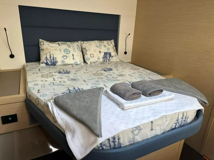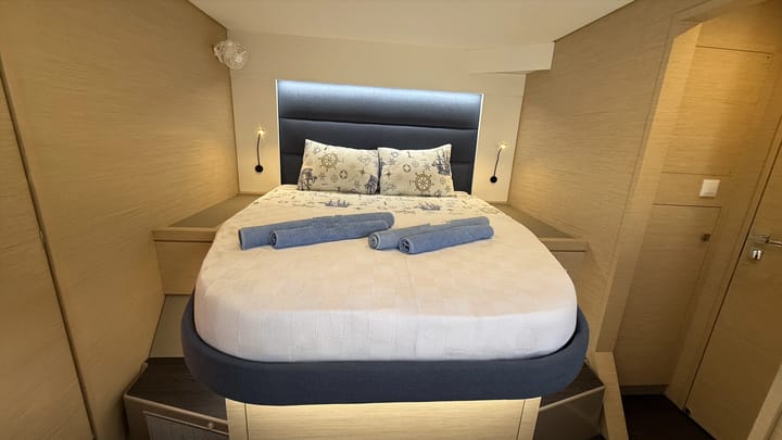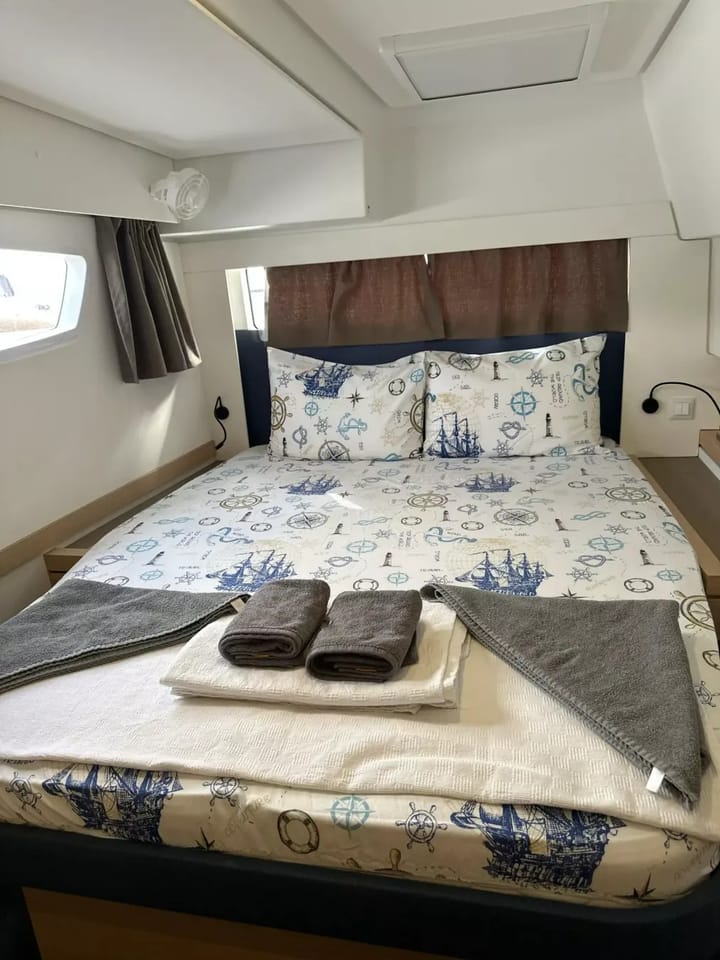 Le Fountaine Pajot Tanna 47 — 2025 fait partie de la dernière génération de modèles de catamarans de luxe alliant élégance, puissance et confort. Avec une longueur de 13,94 mètres, une largeur totale de 7,7 mètres et un tirant d'eau de seulement 1,2 mètre, il garantit une navigation sûre et équilibrée en eaux profondes et peu profondes. L'aménagement intérieur du catamaran comprend un total de 6 cabines : 4 cabines doubles, 1 cabine double superposée et 1 cabine simple. Il peut donc accueillir jusqu'à 11 personnes. La cabine individuelle peut être attribuée au capitaine pour les charters avec un capitaine, mais pour les charters sans capitaine, elle convient à l'hébergement des passagers. Chaque cabine met le confort au premier plan grâce à son design spacieux, ses systèmes de ventilation et ses grands espaces de rangement. Avec 5 douches et des toilettes électriques, une cuisine entièrement équipée (réfrigérateur, congélateur, four, cuisinière, évier, machine à café), la climatisation (dans le salon et les cabines), un chauffage et un système d'eau chaude, il offre une expérience marine dans le confort de la maison. L'équipement de navigation inclut la grand-voile classique et le système de treuils électriques. Flybridge garantit l'indépendance énergétique grâce à un auvent bimini, à des panneaux solaires et à des équipements de production d'eau. Les systèmes de générateur et d'onduleur fournissent une alimentation ininterrompue pour les missions à longue distance, tandis que des panneaux solaires intégrés d'une puissance maximale de 1 700 W permettent une navigation respectueuse de l'environnement. L'équipement de navigation et de sécurité comprend un traceur GPS de type salon, un pilote automatique, une radio VHF, un baromètre, un thermomètre, un guindeau de 1500 W, un système d'ancre et de chaîne, des gilets de sauvetage gonflables automatiques, des tubes à incendie et un radeau de sauvetage. De plus, un équipement de plongée avec tuba et une trousse de premiers secours font partie de l'équipement standard. Les espaces de vie extérieurs spacieux améliorent le confort grâce à des équipements tels que la terrasse Flybridge, le pont avant, les coussins du poste de pilotage, les haut-parleurs de pont, la plateforme de bain et la douche extérieure. Les prises 220 V et 12 V vous permettent de recharger facilement vos appareils électroniques pendant les croisières. Le Fountaine Pajot Tanna 47 — 2025 offre des performances silencieuses et puissantes grâce à un système diesel bimoteur de 2 × 60 CV. La capacité du réservoir est de 940 L, celle du réservoir d'eau est de 700 L. Il offre une excellente efficacité de navigation avec sa grand-voile de 77 m² et ses genovas de 52 m². Avec ses lignes modernes, ses systèmes énergétiques, son volume intérieur spacieux et sa structure sûre, ce catamaran est le choix idéal pour une croisière en bleu, une location avec capitaine privé ou des vacances en famille sur la côte turque.
