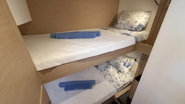 Le 6 -cabin Tanna 47 catamaran a été construit en 2025 et est ancré à Fethiye, Turquie. Le catamaran peut accueillir 11 personnes avec 4 Cabine double, 1 Cabine avec lits superposés et 1 Cabine individuelle . Le catamaran propose des toilettes 6. Ce catamaran propose également 5 douches. Le catamaran peut être loué en tant que skipper coque nue . Caractéristiques de l'équipement du bateau 2 diesel moteur, full batten main sail, poche autobloquante, guindeau électrique et treuils électriques. Il contient également haut-parleur extérieur et haut-parleur intérieur. La cuisine entièrement équipée comprend réfrigérateur, équipement de cuisine, congélateur, four, plaque de cuisson et lave-vaisselle. Ce catamaran est géré par le propriétaire de l'annonce Pelin. Pelin est membre de viravira.co depuis 2019 et possède un Super Boat .