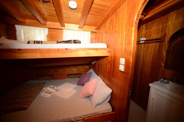 Construite selon le concept classique des goélettes, cette goélette spéciale offre une expérience de croisière bleue idéale pour les familles nombreuses et les groupes d'amis, avec sa structure de 7 cabines pouvant accueillir jusqu'à 18 personnes. Construit en 1996, notre bateau se distingue par sa structure confortable et ses espaces de vie spacieux. Les 7 cabines doubles de bord sont équipées de salles de bains privatives, de toilettes domestiques et de la climatisation. Il y a un système de lits superposés dans 4 des cabines, et toutes les cabines sont conçues pour offrir une utilisation spacieuse, spacieuse et confortable. Les serviettes de bain sont disponibles à bord. À bord de notre bateau dont la structure de pont est de type ketch, vous pouvez profiter de la mer toute la journée avec de grands coussins de soleil sur le pont avant, tandis que sur le pont arrière, vous trouverez un coin salon et une salle à manger idéaux pour vos repas de masse et vos invitations spéciales. Un équipage professionnel de 4 personnes vous accompagne en matière de restauration, de nettoyage et de services généraux tout au long de votre voyage. Les espaces de vie de l'équipage sont prévus pour être séparés de ceux réservés aux invités, en mettant votre confort et votre intimité au premier plan. C'est la goélette ; balade bleue avec hébergement, location de bateaux pour groupes bondés, location de goélettes avec 7 cabines, visite bleue en groupe pour la famille et les amis Il propose des vacances à la mer confortables, sûres et agréables aux clients qui le recherchent.