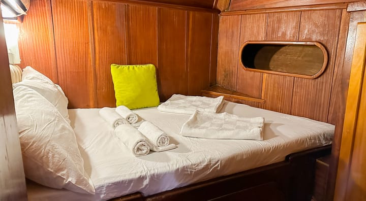 La goélette construite sur mesure de 26 mètres de long est idéale pour les vacances en croisière bleue depuis Fethiye. Elle peut accueillir jusqu'à 17 personnes dans un total de 8 cabines confortables. 3 cabines doubles, 2 cabines doubles et 3 cabines triples sont chacune équipées d'une douche et de toilettes privatives (salle de bains privative). Grâce à son équipage professionnel, l'exploration des baies uniques de la mer Égée offre une expérience de navigation à la fois confortable et sans tracas. Avec sa cuisine entièrement équipée et ses espaces de vie spacieux, c'est une excellente option pour les familles, les groupes d'amis et les amateurs de Blue Cruise. Parmi les options de location de goélettes au départ de Fethiye, vous pouvez garder des souvenirs inoubliables dans les eaux turquoises de la mer