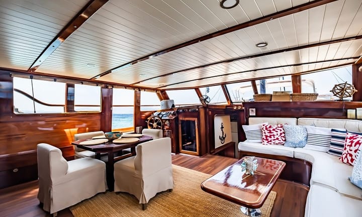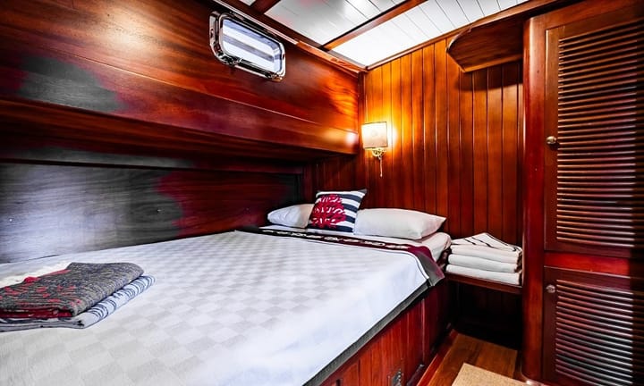 Extremely clean and well maintained, this 20 meter luxury gulet is an ideal choice for those looking for a comfortable and peaceful blue cruise experience. ACCOMODATION: 1 master and 3 double cabins (total capacity of 8 people) Air conditioning, bathroom, WC, towels and hair dryer in all cabins Spacious living room: dining table, seating group, bar and music system Air conditioning is limited to 4-6 hours per day GENERAL HARDWARE: Full safety and navigation equipment, sailing equipment, hot water system, unlimited Wi-Fi in Turkish waters DECK: Teak wood floor, seating area and dining table on the rear deck, sun mats on the front deck, sea staircase and shower KITCHEN EQUIPMENT: Oven, refrigerator, freezer, soft drink cooler, ice and coffee maker AMUSEMENT & MARINE EQUIPMENT: Service boat, 2 canoes, 1 SUP, fishing suits, diving equipment, mask-pallet-snorkel sets, backgammon, okey and playing cards 👉 Take a pleasant, safe and comfortable blue cruise in the Aegean and Mediterranean bays with luxury gulet rental.