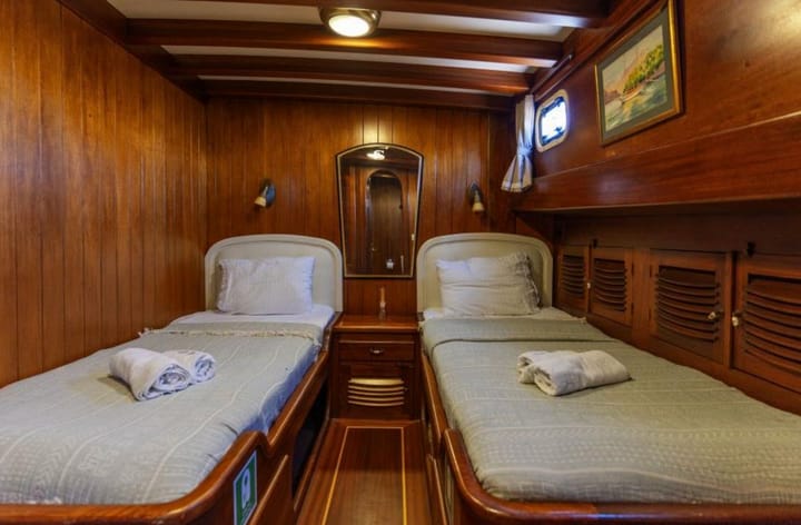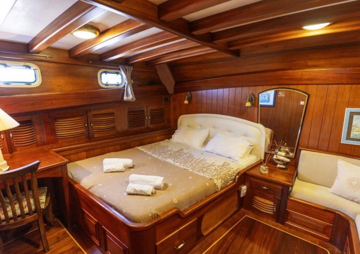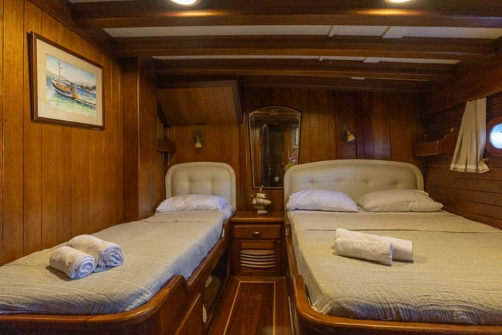 Air-conditioned 1 Master Cabin, 2 Double Beds, 1 Triple and 2 Twin Cabins, Cabin Shower Cabins and restroom, Sun mattresses on the front deck, Seating areas on the front and rear decks, Inside and dining area outside, separate cabin for staff. TV and Bluetooth Music System In Salon, Wifi Internet, Ice Maker, 4.20m Jokerboat 60 Hp Engine, Snorkeling and fishing gear, Backgammon and Playing cards, Paddleboard, Canoe Optional: Water ski, Ringo & Wakeboard