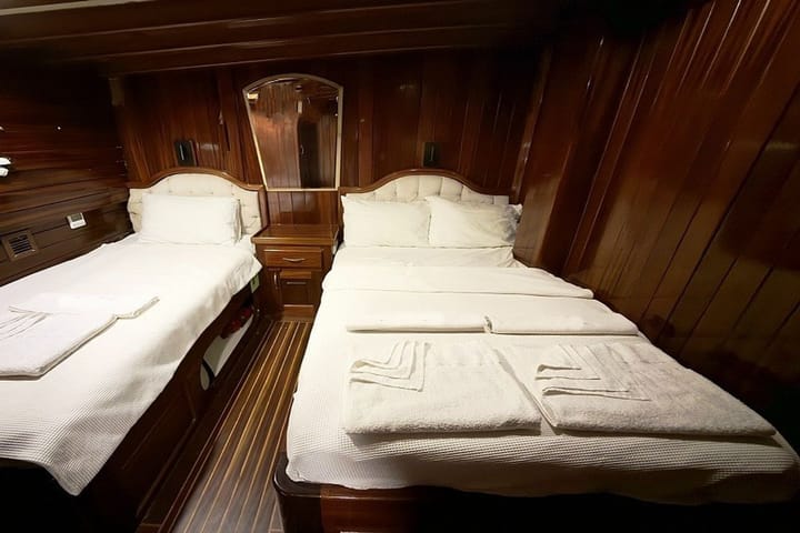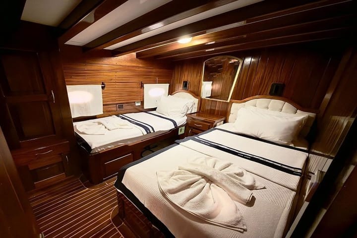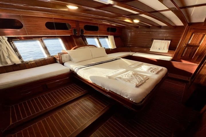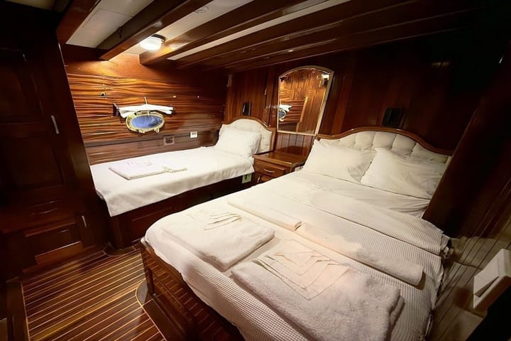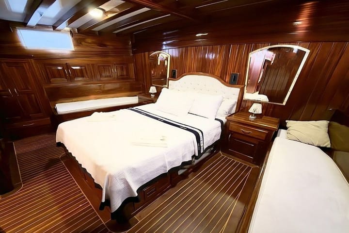 Launched in 2006 and renovated in 2020, it is an ideal gulet boat for blue cruises from Bodrum, which is regularly maintained every year. With a total of 6 cabins, 2 master cabins and 4 triple cabins with 1 double and 1 single bed, which is a great advantage for families with children, offers comfortable accommodation for up to 12 people. The 25-meter wooden hulled ketch gulet provides a safe and pleasant cruise with a cruising speed of 10—12 knots, powerful engine and high fuel-clean water capacity. Moving from Bodrum Port, Cemre Junior puts customer satisfaction at the forefront with its experienced and friendly 4-person crew consisting of captains, cooks and sailors. Suitable for 6 hours daily and night use, fully equipped kitchen, living room and deck TV-satellite system, Wi-Fi, music system, board games and comfortable living areas offer an unforgettable blue cruise experience for families and groups of friends.