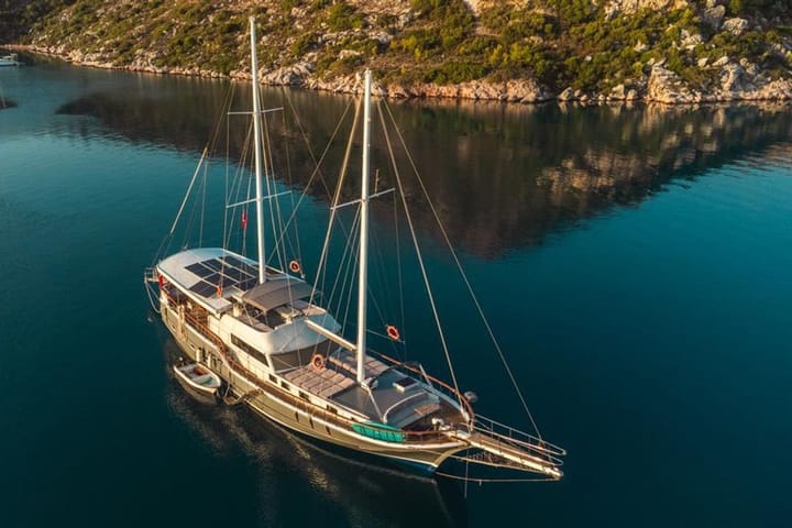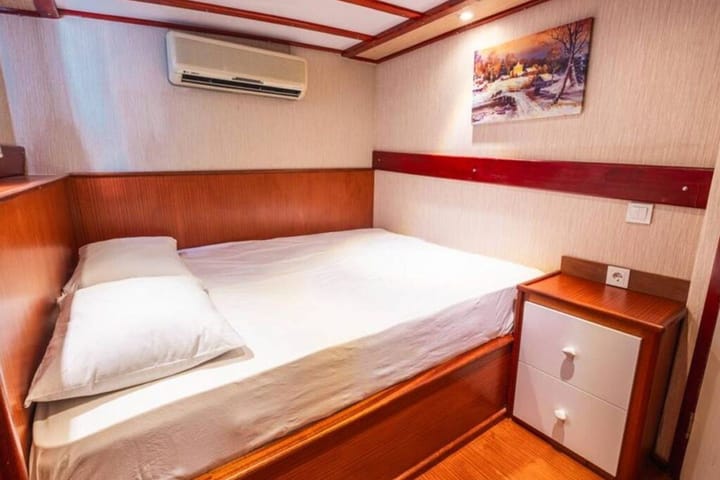 Bozburun Gulet Rental | 25 Meters Air-conditioned and Comfortable Blue Ride Our 25 meter long wooden boat from Bozburun port is an ideal option for our guests looking for an economical and comfortable blue cruise. Our boat, completely renovated in 2023, offers an unforgettable sea holiday in the virgin bays of the Mediterranean and Aegean with its modern design and powerful equipment. Our boat, which has a total capacity of 5 cabins (1 Master, 4 Double), provides accommodation for up to 10 people. All cabins have a private bathroom with shower cabin and household WC. The lounge area is designed with classic and comfortable furniture and offers a comfortable living area with a bar, dining table and spacious seating areas. We offer a comfortable and equipped option for our guests who are looking for bozburun gulet rental, luxury blue cruise, Aegean and Mediterranean boat holidays. We are happy to welcome you on our boat for a comfortable and peaceful sea holiday in the unique bays of the Mediterranean and Aegean. 🌊🚤✨