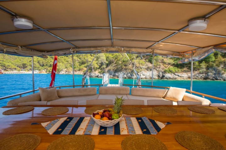 Due to inclement weather, the boat we had chartered couldn't make it from Kaş to Fethiye. However, Mr. Sezer, the manager of the boat company, allocated us a 35m boat with 8 cabins, 8 toilets, and three rooms with separate beds (even though there were also children's beds in those rooms) at no extra cost. Many thanks. The cook's food was tasteless.
