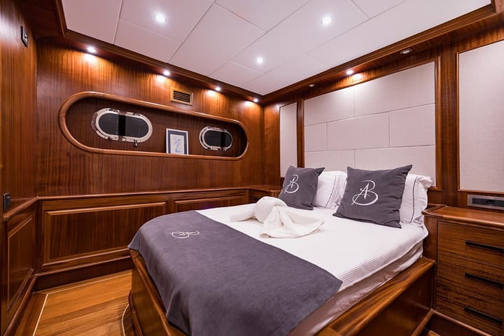 With a length of 24 meters, this stylish gulet is an ideal option for families and groups of friends looking for a comfortable and enjoyable blue ride. It accommodates up to 11 guests with a total capacity of 5 cabins. The cabinet distribution is in the form of 2 Master, 2 Double and 1 Triple. All cabins have a private WC and shower. Air conditioning is available in all lounges and cabins for up to 12 hours per day (24-hour use is at an additional cost). Smart TV, Bluetooth music system and free Wi-Fi are available in public areas. For a comfortable holiday, clean linen, bath and sun towels are provided, as well as laundry and ironing services. Facilities that enhance the enjoyment of the sea include paddle boards, snorkel sets, basic fishing equipment and board and card games. There is a 5.30 m service boat (115 HP) for swimming breaks and shore transfers. About 100—110 nautical miles are cruised on weekly blue voyages. Optional water sports (ringo and water skiing) are offered as an additional service for guests who want a more active holiday. Combining comfort, functionality and enjoyable sea activities, this gulet offers a peaceful and unforgettable blue cruise experience.