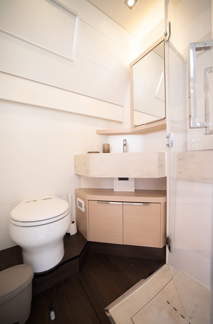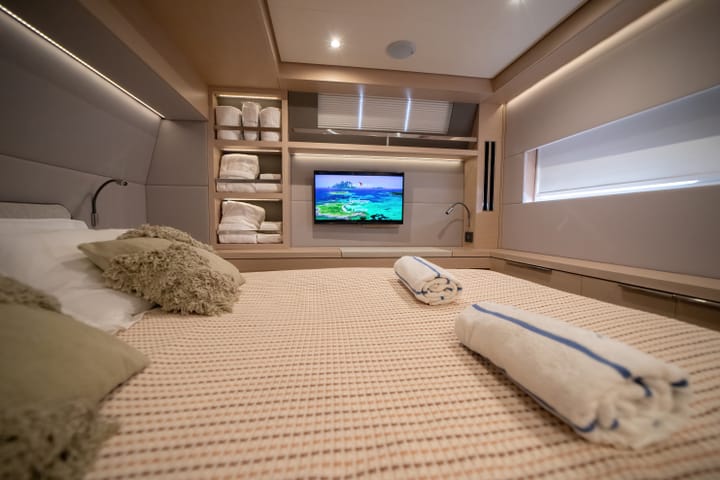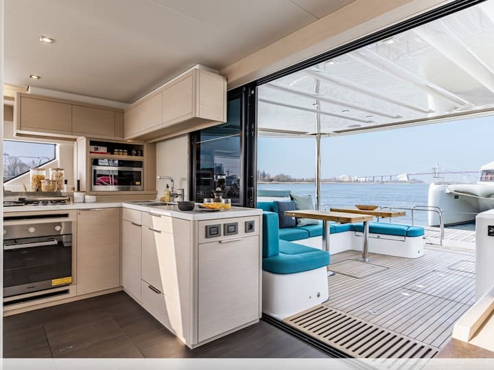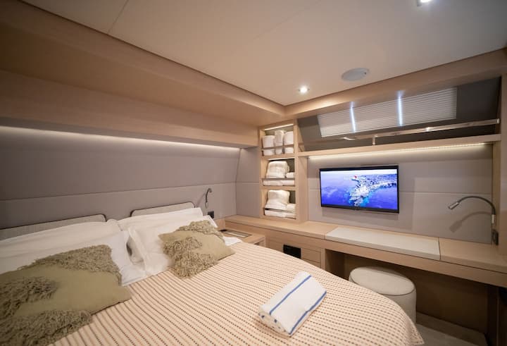 5 -cabin Lagoon 55 catamarano è stato costruito nel 2023 ed è ancorata a Capo d'Orlando, Italia. Il catamarano può ospitare fino a 8 persone . Il catamarano offre 5 bagni. La catamarano è navigata da uno skipper professionista . Caratteristiche dell'attrezzatura per barche 1 motore, batten completo vela principale e fiocco autovirante. Vanta anche tv e altoparlante esterno. La cucina completamente attrezzata include frigorifero e macchina da caffè. il gestore della flotta è membro di viravira.com dal 2019 .