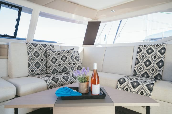 6 -cabin Fountaine Pajot Saona 47 catamarano è stato costruito nel 2020 ed è ancorata a Lavrion, Grecia. Il catamarano può ospitare fino a 10 persone . Il catamarano offre 5 bagni. La catamarano può essere noleggiata come bareboat . Caratteristiche dell'attrezzatura per barche 2 motore, batten completo vela principale e fiocco autovirante. Vanta anche tv, altoparlante esterno e altoparlante interno. La cucina completamente attrezzata include frigorifero, attrezzatura da cucina, forno a microonde, congelatore, forno, piano cottura e macchina da caffè. il nostro partner esperto è membro di viravira.com dal 2019 .
