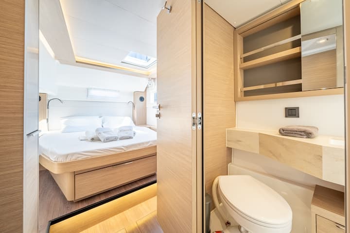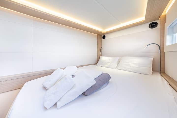 5 -cabine Lagoon 46 catamaran werd gebouwd in 2024 en ligt verankerd in Gouvia, Griekenland. De catamaran is geschikt voor maximaal 12 personen . De catamaran biedt 5 badkamers. De catamaran kan worden gehuurd als bareboat . Kenmerken van bootuitrusting 2 motor, full batten grootzeil en zelfklevende jib. Het bevat ook luidspreker voor buiten en luidspreker aan de binnenkant. De volledig uitgeruste kombuis bevat koelkast, keukenapparatuur, oven, kookplaat en koffiemachine. Deze catamaran wordt beheerd door de eigenaar van de advertentie, Vaggelis. Vaggelis is lid van viravira.co sinds 2019 en eigenaar van een Super Boat .