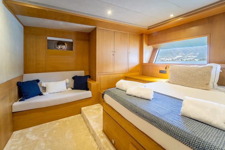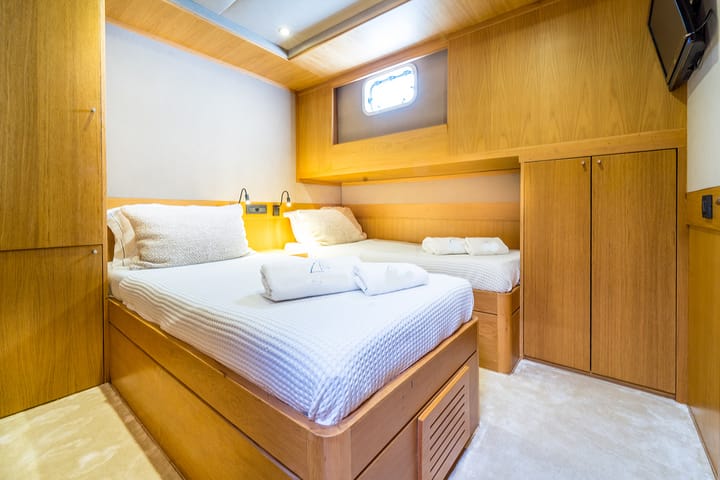 Deze ruime en comfortabele motorsailer is volledig gerenoveerd in 2021 en combineert zijn klassieke buitenkant met een modern interieurontwerp en biedt een luxe charterervaring aan de Turkse kust. In totaal zijn er 5 cabines die comfortabel plaats bieden aan 10 gasten. De indeling is in de vorm van 2 hoofdcabines, 1 tweepersoonscabines en 2 tweepersoonshutten. Vooral de hoofdcabine achterin met panoramisch uitzicht op zee valt op door zijn romantische sfeer. Alle hutten hebben een eigen badkamer en zijn uitgerust met airconditioning die 24 uur per dag geopend is. Het ruime achterdek is ontworpen om op elk moment van de dag een aangename tijd te hebben, met comfortabele kussens op de volle breedte, een eettafel voor 10 personen en een volledig uitgeruste bar voor snelle service. De opvouwbare luifel met softtop, die indien nodig tot dekniveau kan worden verlaagd, biedt bescherming tegen zon en wind. Het voordek biedt een ruime woonkamer met voldoende zonnematten voor alle gasten en een zithoek met twee cocktailtafels bij zonsondergang. De tender van 6,80 m en de buitenboordmotor van 200 pk zijn behoorlijk krachtig in vergelijking met veel boten in zijn klasse en bieden een hoog niveau van watersportervaring. De professionele bemanning van 5 personen biedt onberispelijke service en gerenommeerde Turkse gastvrijheid, waardoor uw vakantie echt onvergetelijk wordt. Het is een uitstekende keuze voor gezinnen, vriendengroepen en gasten die op zoek zijn naar een comfortabele blauwe attractie.