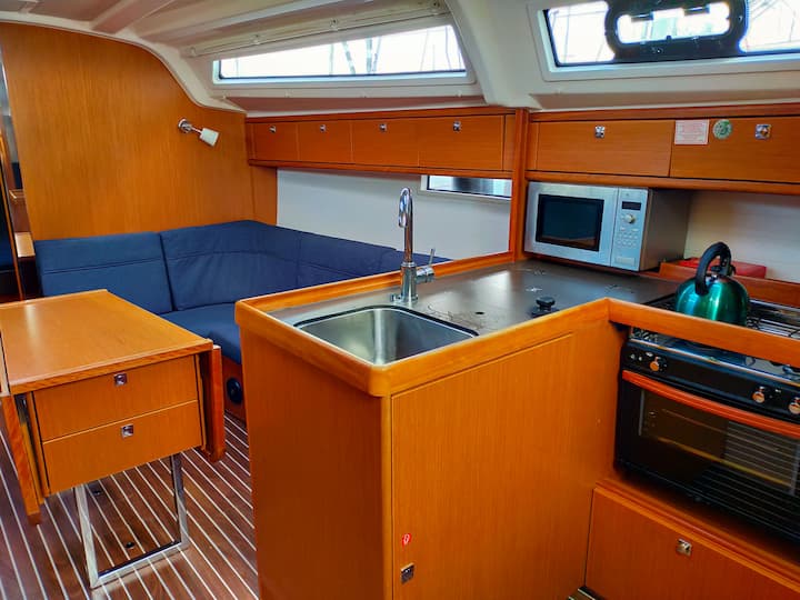 3-cabin Bavaria 37 Cruiser sailboat was built in 2018 and it is anchored in Altefähr, Germany. The sailboat can accommodate up to 8 people. The sailboat offers 1 bathrooms. The sailboat can be rented as bareboat. Boat equipment features 1 motor, full batten main sail, self-tacking jib and bow thruster. It also boasts an outside speaker and inside speaker. The fully-equipped galley includes a refrigerator, kitchen equipment, microwave, oven and stovetop. This host is a viravira.co member since 2022.