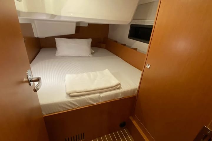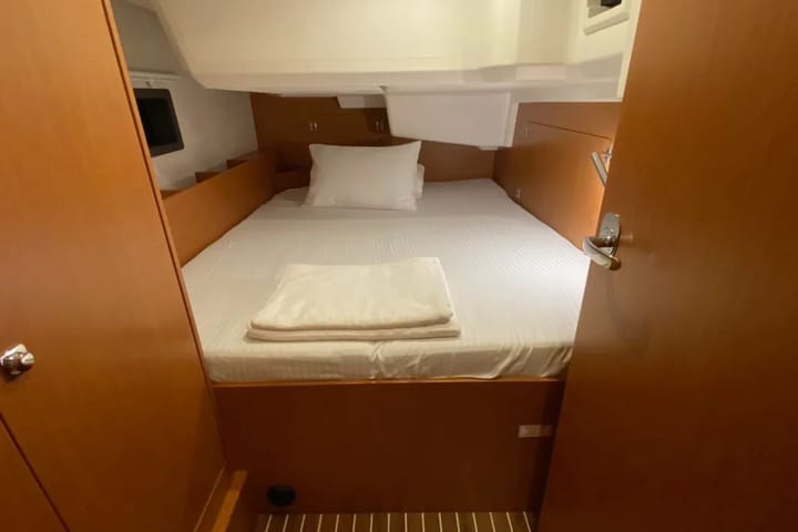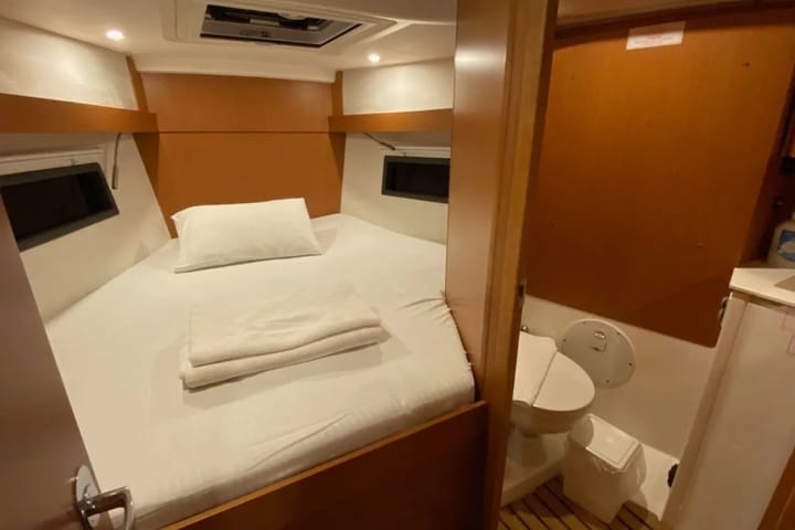 The 2024 model 37 ft sailing boat stands out for its modern design and comfortable equipment for blue cruises departing from Fethiye Marina İmbat. Due to its layout with 3 cabins and accommodation capacity for 6 people, it is an ideal yacht rental option for families and groups of friends. The boat has 2 WC/showers, providing extra comfort on long voyages. The coiled mainsail and self-tacking jib gear offer easy and safe sailing, while the bow thruster and autopilot increase maneuvering and cruising comfort. With its 29 HP engine power, balanced hull structure and 5 ft draft, it provides easy access to Fethiye and surrounding bays. Comfort equipment includes teak deck, cockpit cushions, bimini, sprayhood, solar panels, cockpit speakers, inverter and electric toilet. Offering both performance and comfort together, this sailing yacht offers a high-end blue cruise experience for those looking for Fethiye yacht charters.