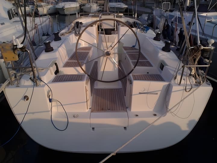 3-cabin Hanse 400 sailboat was built in 2006 and it is anchored in Kos, Greece. The sailboat can accommodate up to 6 people. The sailboat offers 2 bathrooms. This sailboat also provides 2 showers. The sailboat can be rented as skippered or bareboat. Boat equipment features 1 motor, electric windlass. It also boasts an outside speaker and inside speaker. The fully-equipped galley includes a refrigerator, kitchen equipment, oven and stovetop. This sailboat is operated by the listing owner Dimitri. Dimitri is a viravira.co member since 2019 and a Super Boat Owner.
