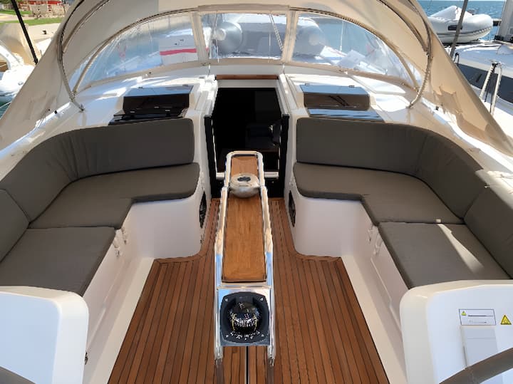 4-cabin Hanse 458 sailboat was built in 2019 and it is anchored in Lavrion, Greece. The sailboat can accommodate up to 10 people. The sailboat offers 2 bathrooms. The sailboat can be rented as bareboat. Boat equipment features 1 motor, full batten main sail, self-tacking jib and bow thruster. It also boasts an outside speaker and inside speaker. The fully-equipped galley includes a refrigerator, kitchen equipment, freezer, oven and stovetop. This sailboat is operated by the listing owner Apostolos. Apostolos is a viravira.co member since 2019 and a Super Boat Owner.