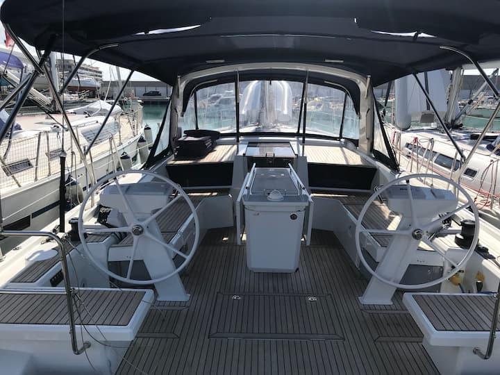 4-cabin Beneteau Oceanis 46.1 sailboat was built in 2019 and it is anchored in Portisco, Italy. The sailboat can accommodate up to 10 people. The sailboat offers 4 bathrooms. The sailboat can be rented as bareboat. Boat equipment features 1 motor, full batten main sail, self-tacking jib and bow thruster. It also boasts an outside speaker and inside speaker. The fully-equipped galley includes a refrigerator, kitchen equipment, oven, stovetop and coffee machine. This sailboat is operated by the listing owner Gianluca. Gianluca is a viravira.co member since 2019.